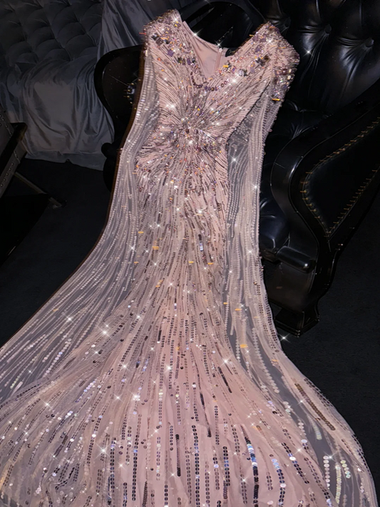 Light pink V-neck sleeveless fitted long sexy ball gown, bridal dress R8756