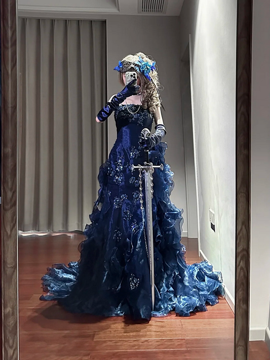 Light blue off-the-shoulder fitted waist short skirt with train ball gown R8632