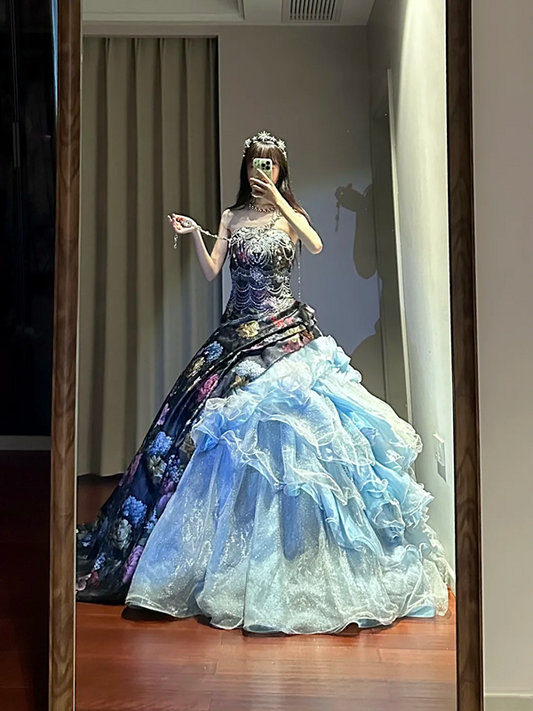 Black retro-style strapless, fitted waist ball gown with light blue tulle skirt R8634