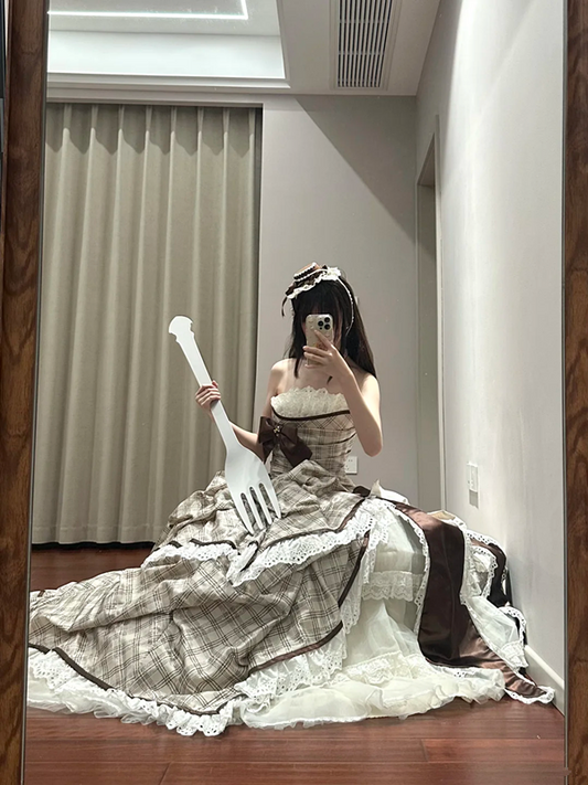 Light brown checkered strapless waist-cinching long ball gown R8636