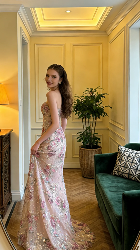 Pink retro floral strapless fitted waist bodycon long ball gown, bridal dress R8576