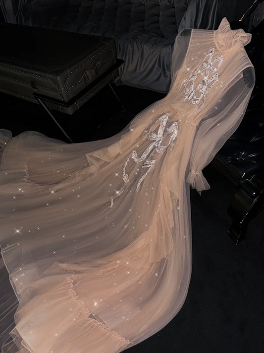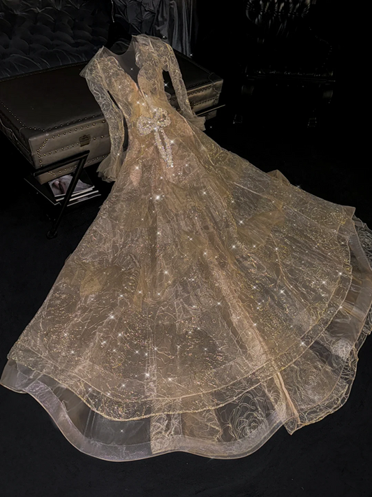 Light apricot long-sleeved fitted and sexy long ball gown/bridal dress R8760