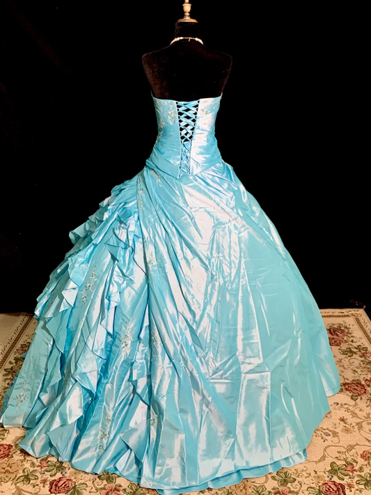 Light blue strapless, fitted waist, full skirt, long princess ball gown R8670
