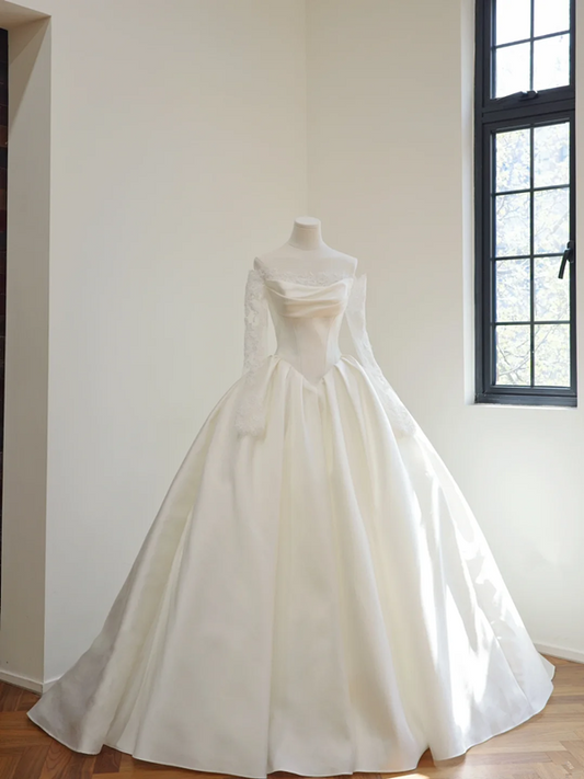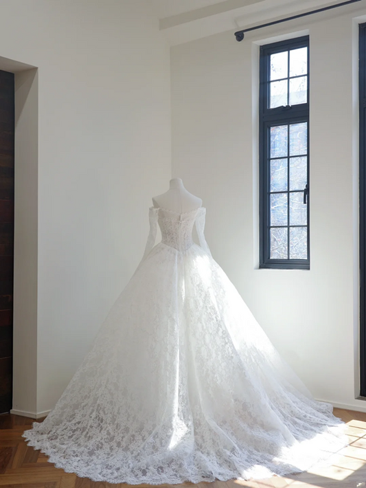 White off-the-shoulder, fitted waist, full skirt, long ball gown R8510