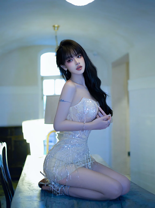 Apricot Strapless Silver-Sequin Waist-Cinched Fitted Bodycon Sexy Short Prom Dress R7098