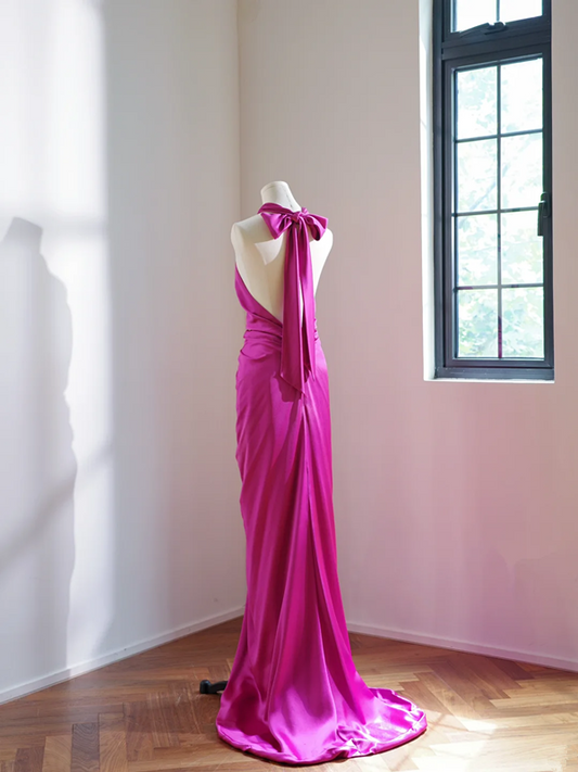 Rose pink halter neck fitted waist backless sexy long ball gown R8469