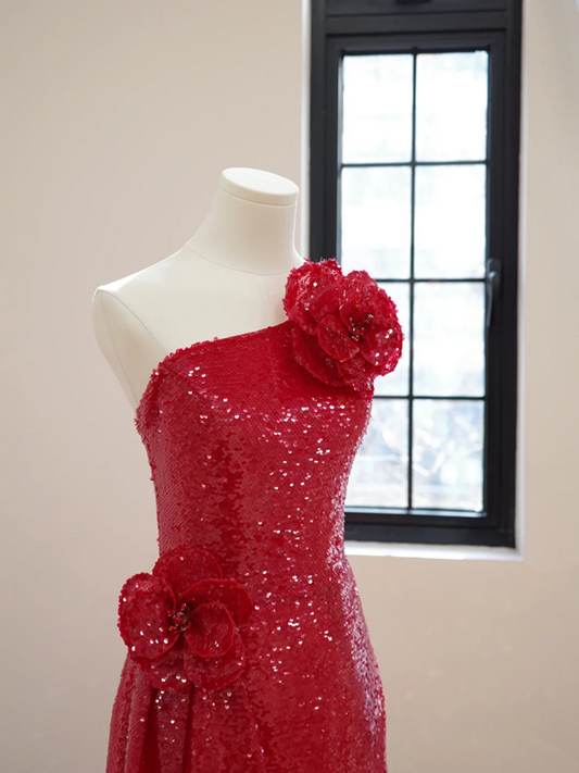 Red asymmetrical neckline, fitted waist, long ball gown R8473