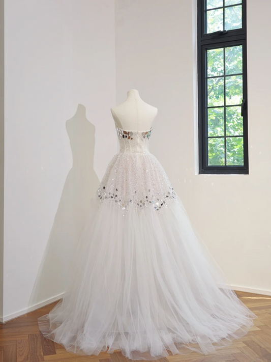 White sequined strapless, fitted waist, full skirt, long ball gown, bridal dress R8476
