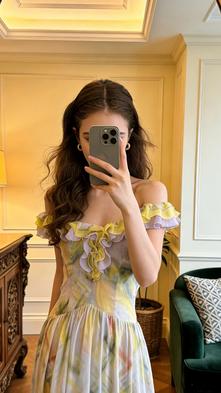 Yellow-green strapless, fitted waist, puffy cake skirt, long ball gown R8700