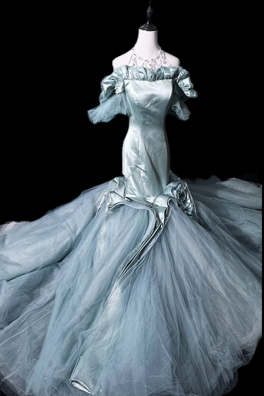 Gray-blue off-shoulder fitted waist bodycon mermaid long ball gown R8699