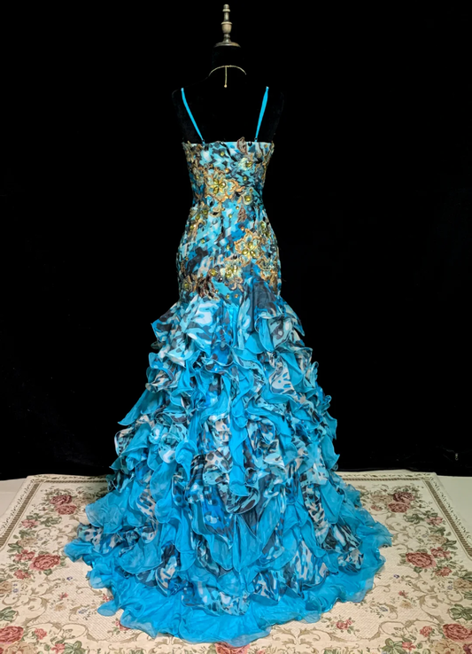Blue retro floral halter-neck fitted bodycon long ball gown R8672