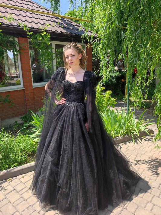 A LINE BLACK LONG PROM DRESSES, OFF SHOULDER TULLE LONG EVENING DRESS WITH SEQUIN TULLE S1356