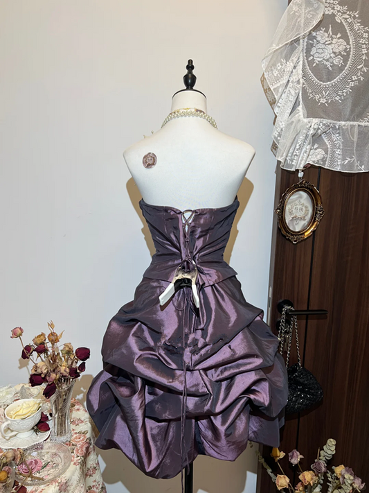 Dark purple tube-top dress with slim waist and puffy skirt, prom dress R5353