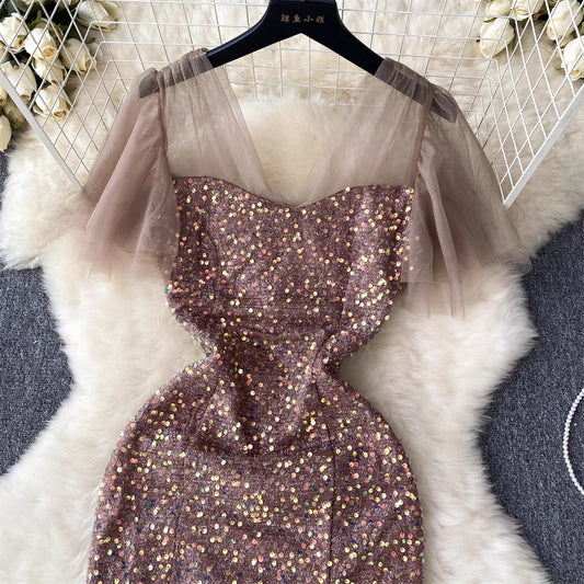 Elegant Sequins Velvet Mesh Long Sleeve Party Dress S542