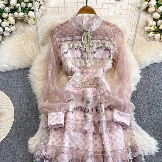 fashionable long-sleeved lace dress elegant long skirt S4069