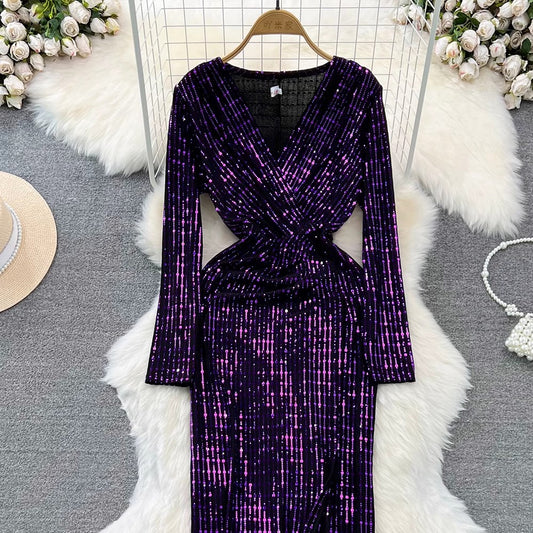 Fashionable long-sleeved V-neck mid-length velvet sequin dress S3956