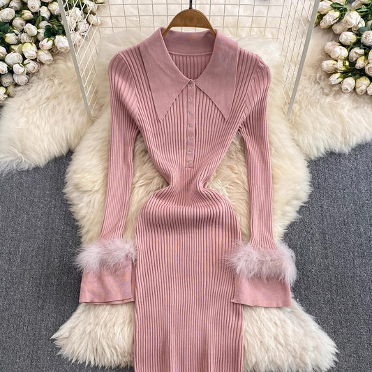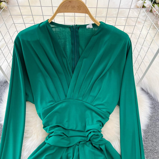 fashionable long-sleeved V-neck pleated waist mid-length slit A-line dress S4484