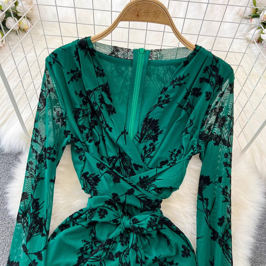 Fashionable long-sleeved V-neck mid-length A-line printed dress S4114