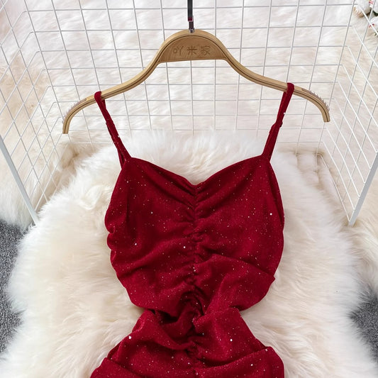 Fashionable sparkling glitter suspender backless sleeveless dress S4276