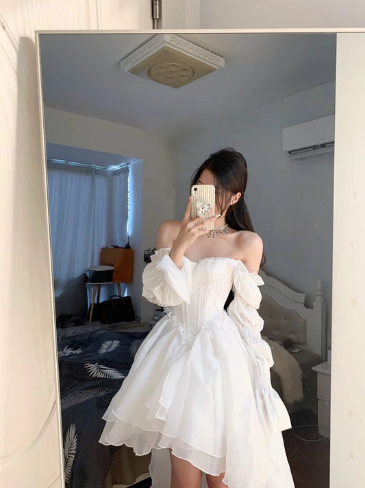 French-style waist white long dress puff sleeve cake dress homecoming dress R5157