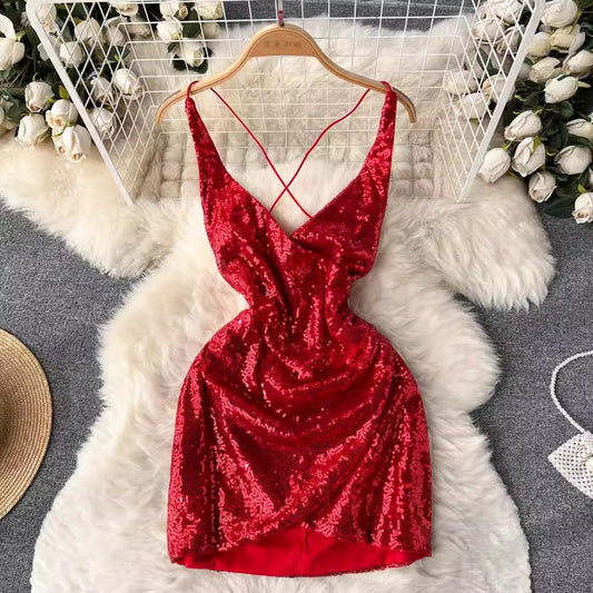 Glittery V-neck Suspender Dress Fashionable Lady Dress S4668