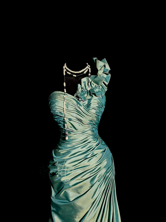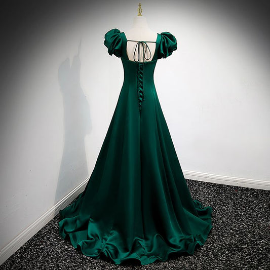 Green Satin Square Puff Sleeve Pleats Prom Dress S5314