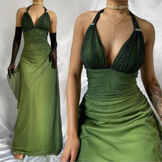 Green V Neck Halter Shiny Vintage Long Prom Dress S6131