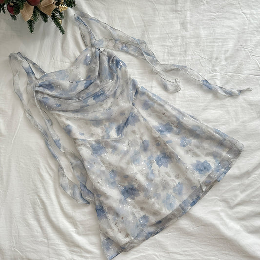 Holiday style blue v-neck halter dress unique and beautiful waist temperament long dress 2025 new R0454