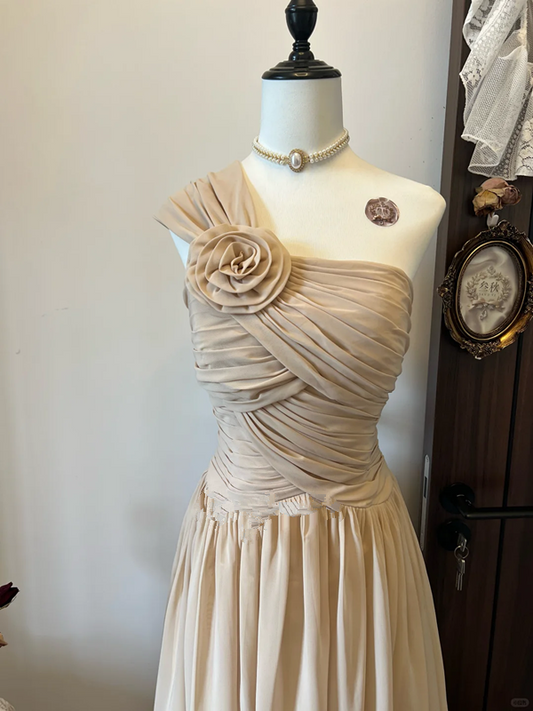 Khaki off-shoulder asymmetrical neckline with pleated waist long skirt for homecoming R4314