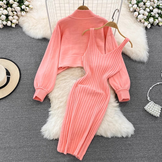 knitted shawl jacket two-piece set for women V-neck suspender dress S4119