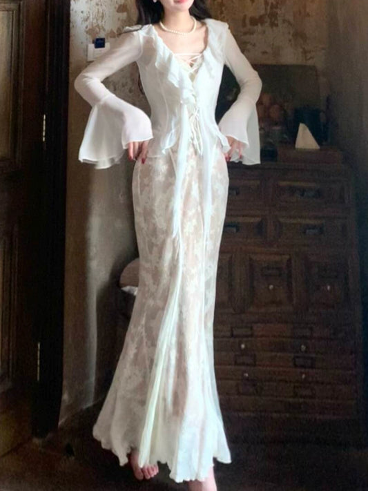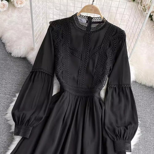 lace lantern sleeve chiffon A-line dress elegant long skirt S4309