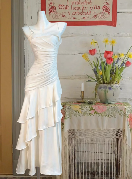 Light-colored suspender satin pleated waist slim ruffled skirt long dress, ball gown R6239