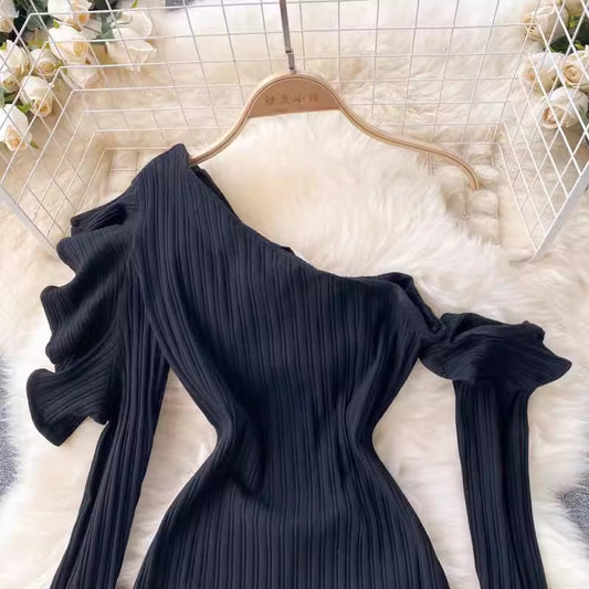Little black dress one shoulder dress waist black high-end temperament skirt R1996