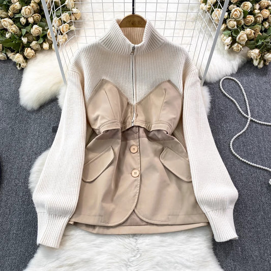 long-sleeved knitted patchwork A-line mesh dress two-piece vest jacket S4096