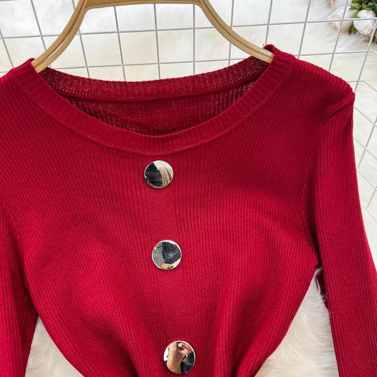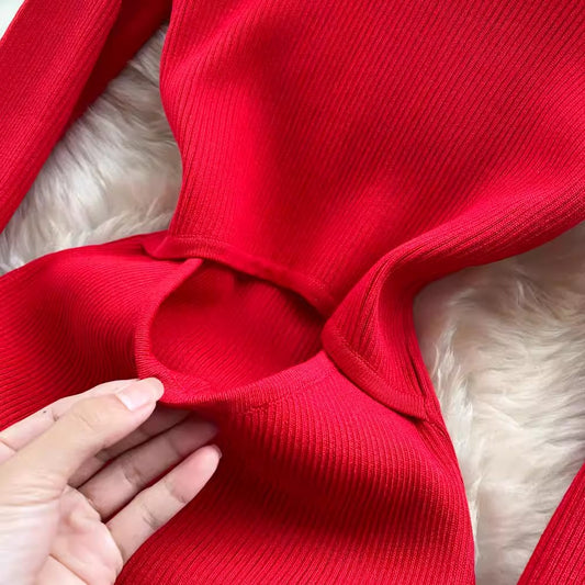 long-sleeved round neck elastic tight mid-length knitted dress S4010
