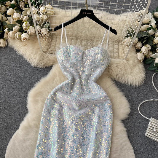 Luxurious suspender dress for women sparkling sequin design chic long skirt S4618