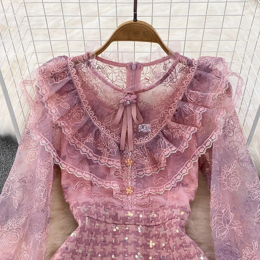 luxurious round-neck ruffled lantern long-sleeved lace sequined A-line dress S4273