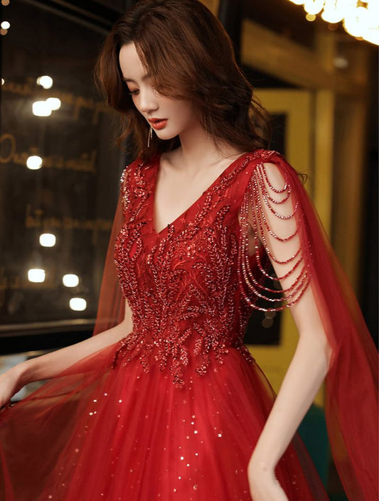 Luxury Charming Wine Red Lace V-neck Prom Party Evening Dress S3593