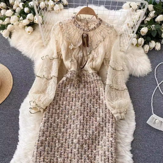 luxury V-neck sequined dress design puff sleeve long party dress S6060
