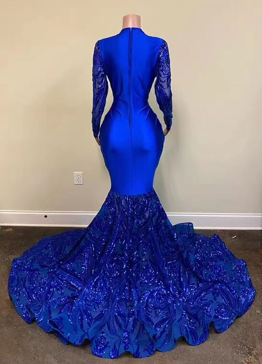 Mermaid Royal Blue Long Sleeevs Deep V Neck Prom Dresses Formal Evening Dresses S2418