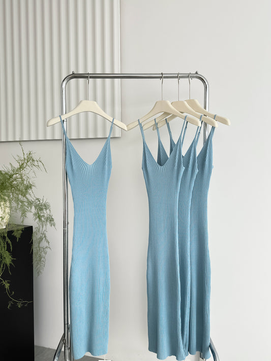 Misty blue pure slim long skirt suspenders knitted dress R2087
