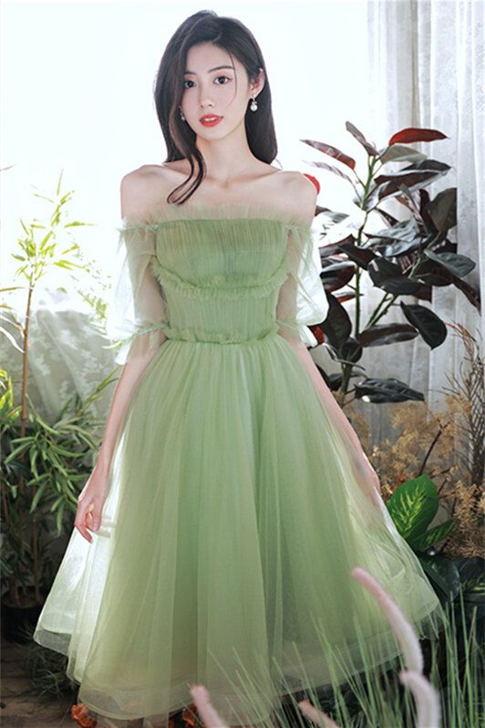 Off the Shoulder Green Tulle Short Sleeves Party Dress S3116