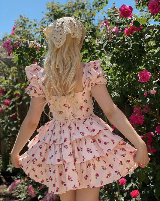 Pink Floral Puff Sleeve Waist A-Line Cake Skirt Homecoming Dress R4000