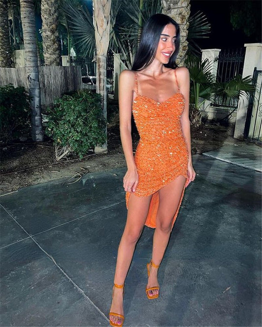 Sexy Orange Glitter Prom Dresses Short Front Long Back Sweetheart Spaghetti Straps Formal Party Cocktail Dress S2660