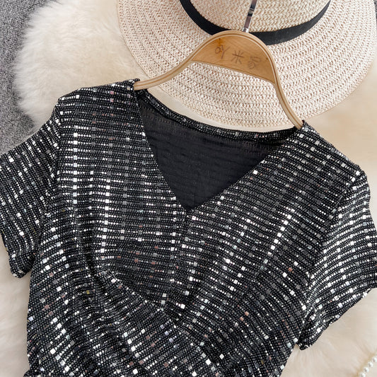 Shiny skirt irregular one-shoulder slim princess short skirt homecoming dress R2543