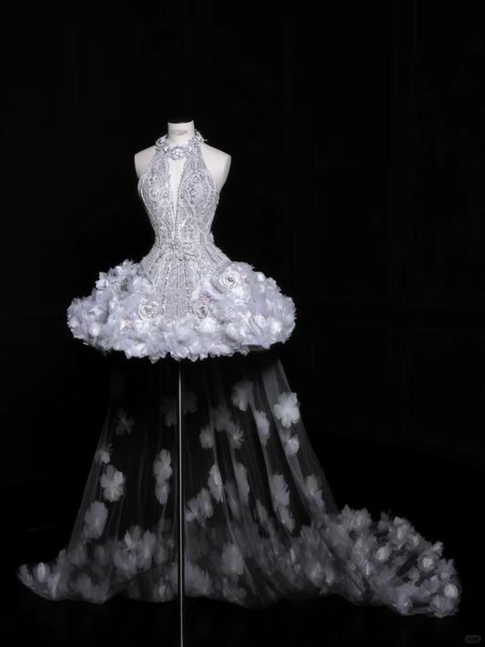 Silver halter-neck rhinestone high-waisted tulle skirt long ball gown R7000