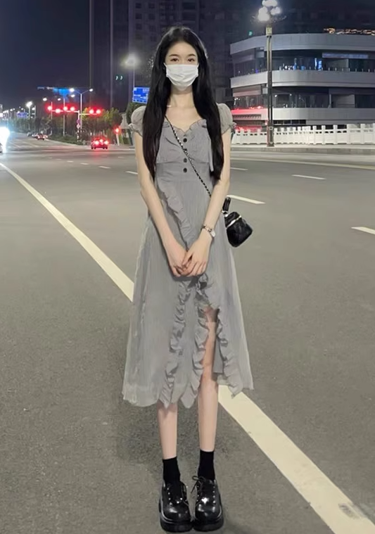 Silver Moonlight Long Ruffled Dress Square Neck Slimming Slit Long Dress Women R0077