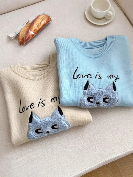 Sweet cute cat embroidery round neck casual long-sleeved sweater S4787