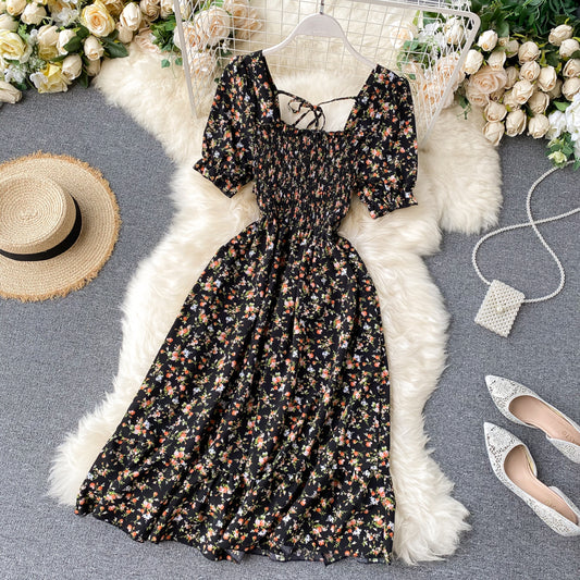 Sweet French Square Neck Short Sleeve Pleated Floral Chiffon Dress S4467