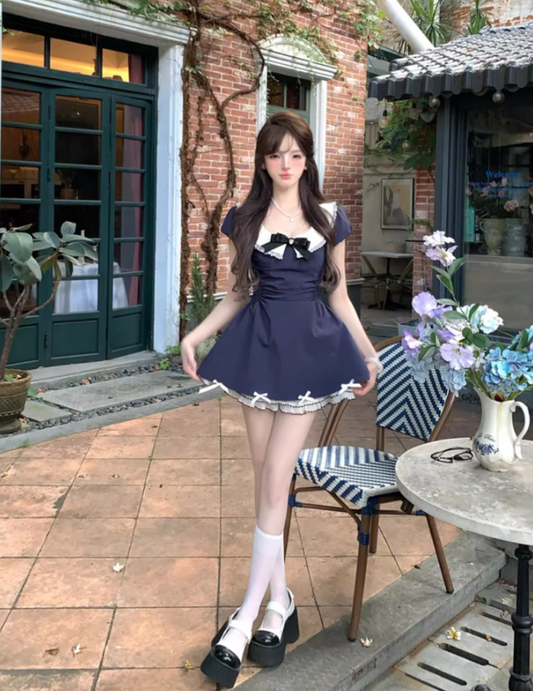Sweet doll collar short-sleeved dress 2025 waist bow puffy princess skirt R1153